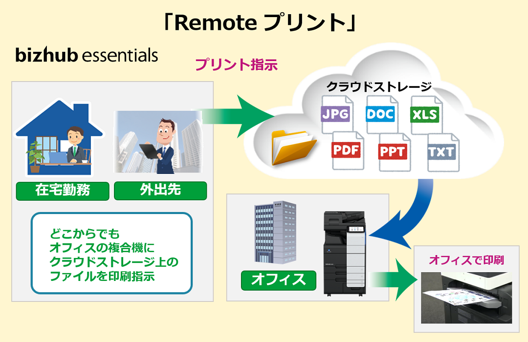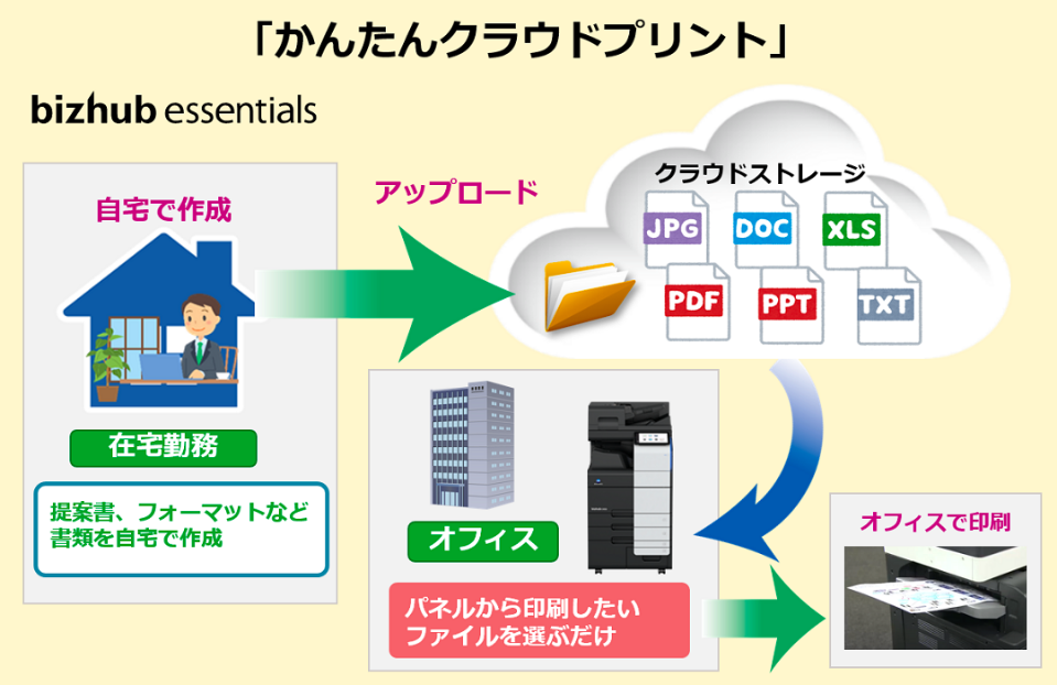 コニカミノルタのbizhub essentialsでは様々なクラウドストレージと連携し、複合機から直接印刷することができます。