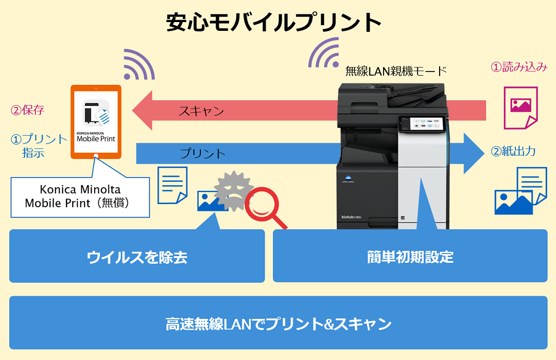 - 煩わしい初期設定を必要とせず、直接モバイル端末から複合機に印刷指示可能
