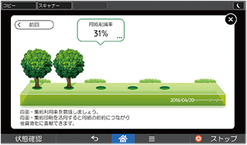 インフォメーション画面には、本体の総印刷枚数や利用者ごとの印刷枚数、両面印刷率、集約利用率、用紙削減率や、管理者からの任意のメッセージを表示することができます。