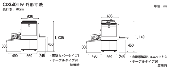 | 給紙台・排紙台収納時:805mm(W)×705mm(D)×1,035mm(H)* | ||