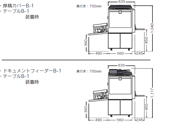 | 大きさ | 給紙台・排紙台使用時:1,370mm(W)×705mm(D)×638mm(H)* 給紙台・排紙台収納時:805mm(W)×705mm(D)×638mm(H)* テーブルのみ:560mm(W)×675mm(D)×402mm(H) |