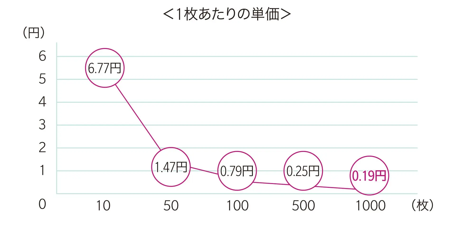 デジタル孔版印刷機は1枚のマスター(版)で複数枚のプリントをするため、一度にプリントする枚数が多いほど、1枚あたりのランニングコストが低減します。1,000枚プリント時には1枚あたり約0.19円※と、圧倒的なコストパフォーマンスを実現します。