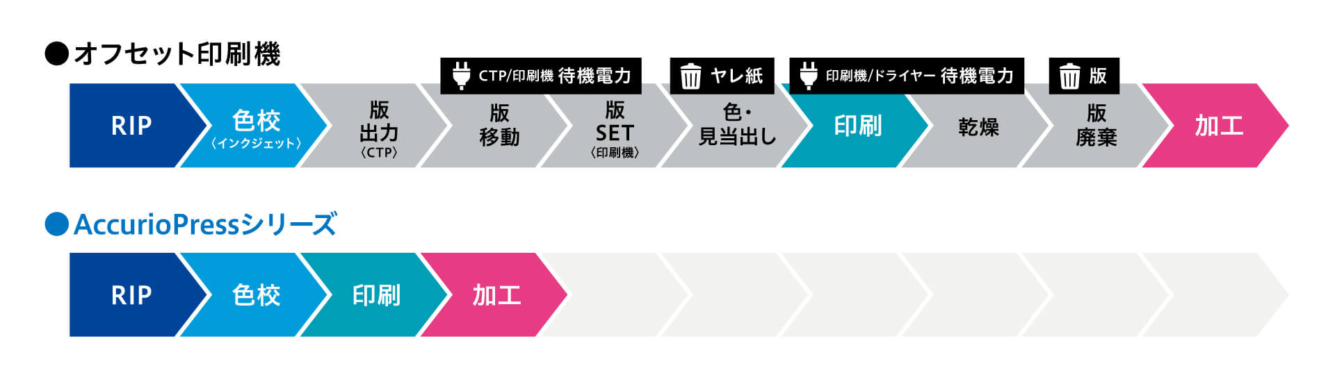 従来の印刷方式とデジタル印刷方式を比較した場合、刷版、調肉作業、見当合わの工程を削減でき、これにより生産効率の向上や消費電力の低減、損紙低減、版の廃棄や廃液レスが可能となります。