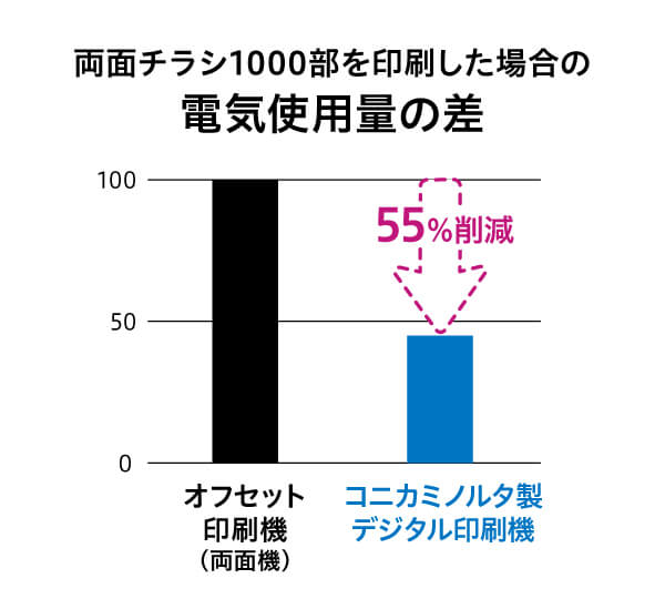 一般的なオフセット印刷機の消費電力と、コニカミノルタ製デジタル印刷機の消費電力を比較すると、1000部の両面チラシを印刷した場合、約55%の電力低減が可能です。