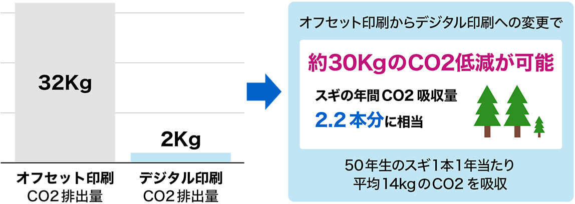 上質コート紙110Kgを使用し、印刷物を年4回印刷した場合のデジタル印刷とオフセット印刷の印刷準備用紙の量(重さ)からCO2排出量を比較すると以下の結果となります。