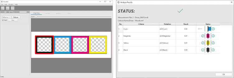 エンジン色域チェックにより、プリンターエンジンの色調整結果がコニカミノルタの基準に適合しているかを確認します。オペレーターはその結果を見て再調整の判断をできます。これにより、プリンターエンジンが適正に設定され、最適で安定した色再現を可能とします。また、プリンタープロファイル作成に先立ち、使用する用紙での色域再現が実際のターゲット色域と対応しているかをチェックできます。余計な作業を減らし、適切な用紙選択およびターゲットカラーの品質を事前に確認することができます。