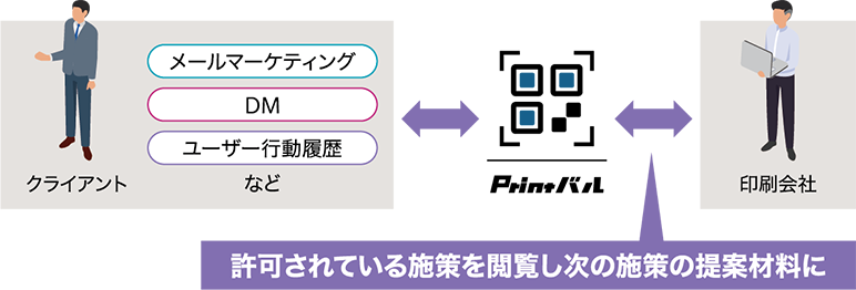 クライアントはメールマーケティングやDM設定など、機能ごとに印刷会社に運用代行を依頼することができます。運用代行を設定いただくと、印刷会社は設定はもちろん、施策の実施結果も確認することができるため、次に実行する施策の提案につなげることができます。