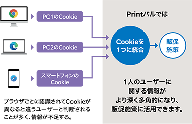 現在は会社用PC、会社用スマホ、プライベート用スマホ、など複数デバイスを利用しているユーザーも少なくありません。しかし従来のマーケティングオートメーションでは各端末のCookie毎にユーザーが分かれていたため、正確にユーザー行動を把握することは多くのマーケティングオートメーションではできません。しかしPrintバルなら、ユーザーが持つ複数ブラウザ(PCやスマートフォン)を統合し、1人のユーザーとして認識することができます。よって他社マーケティングオートメーションより深く多角的なユーザー情報を活用しての販促施策運用が可能です。