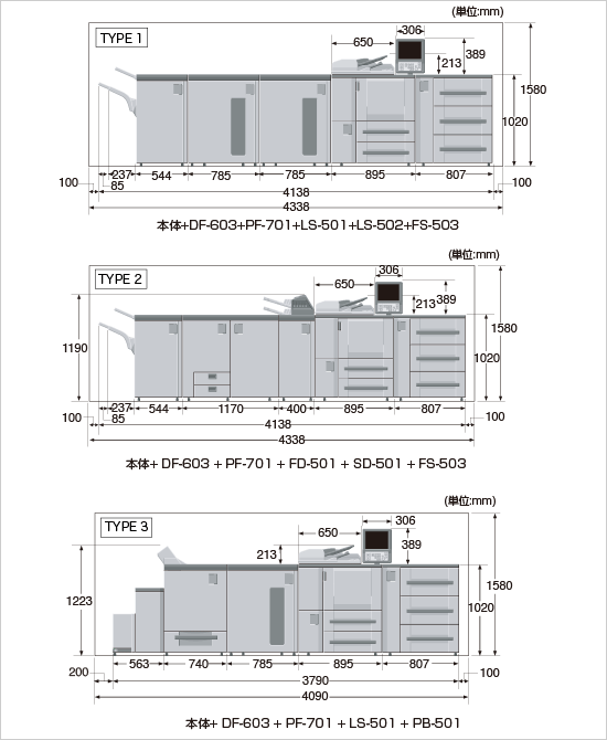 | 大きさ | 1,170(幅)×1,020(高さ)×775(奥行き)mm(奥行きは中綴じトレイ収納時) 中綴じトレイ引き出し時:1,441(奥行き)mm |