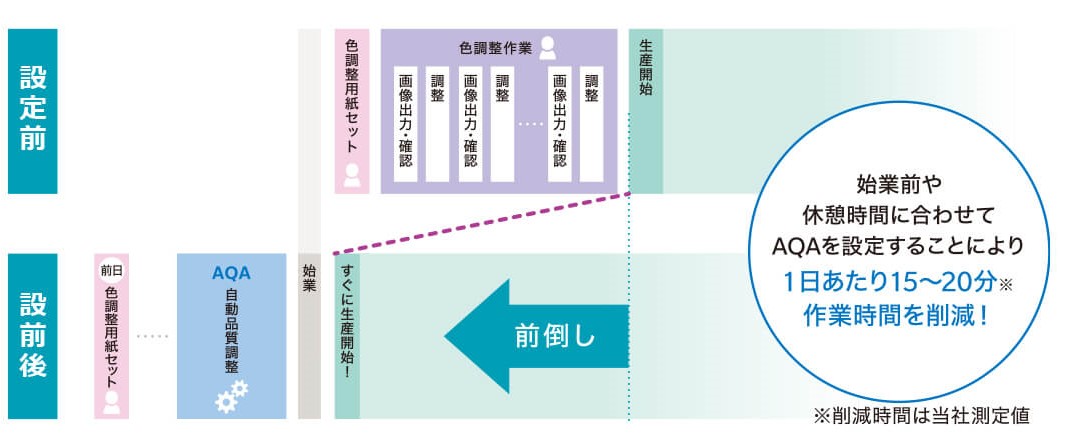 印刷前調整作業に必要な表裏見当や色調整などの工数削減により生産時間を拡大します。