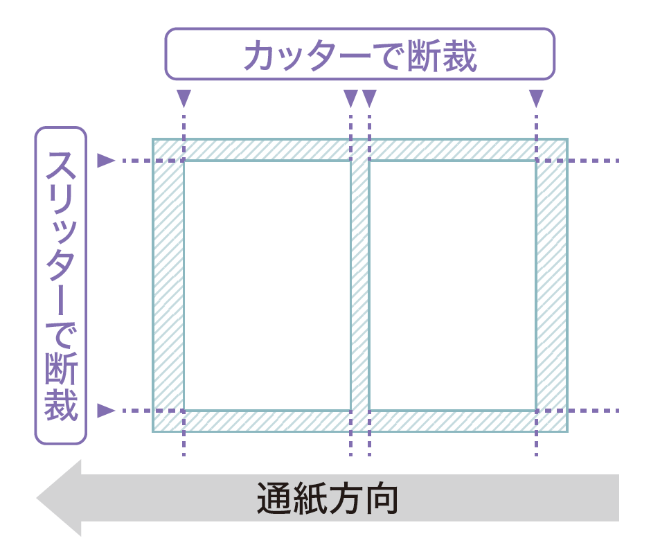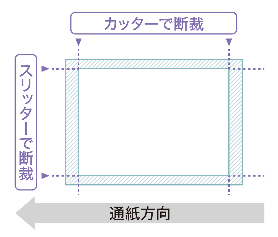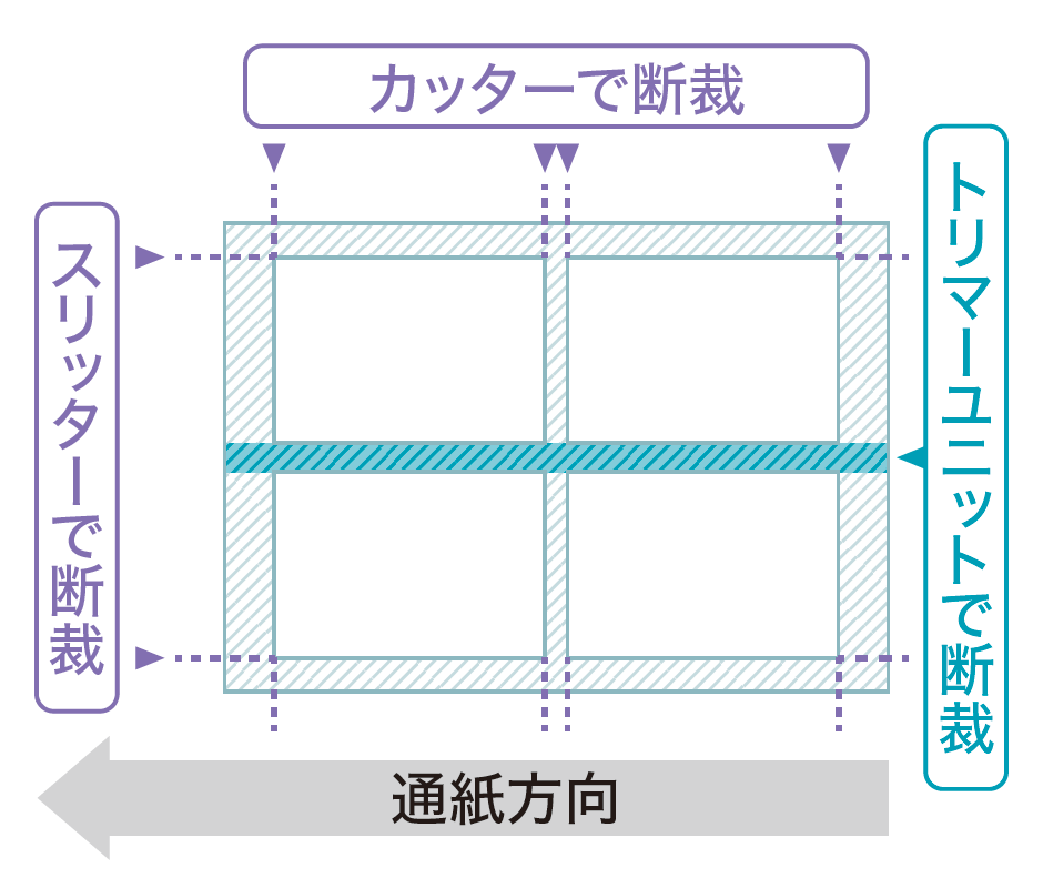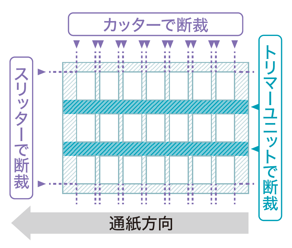 四方断裁のとき、通紙交差方向に複数回カットを行い、四面連刷ハガキを十字断裁により切り出します。