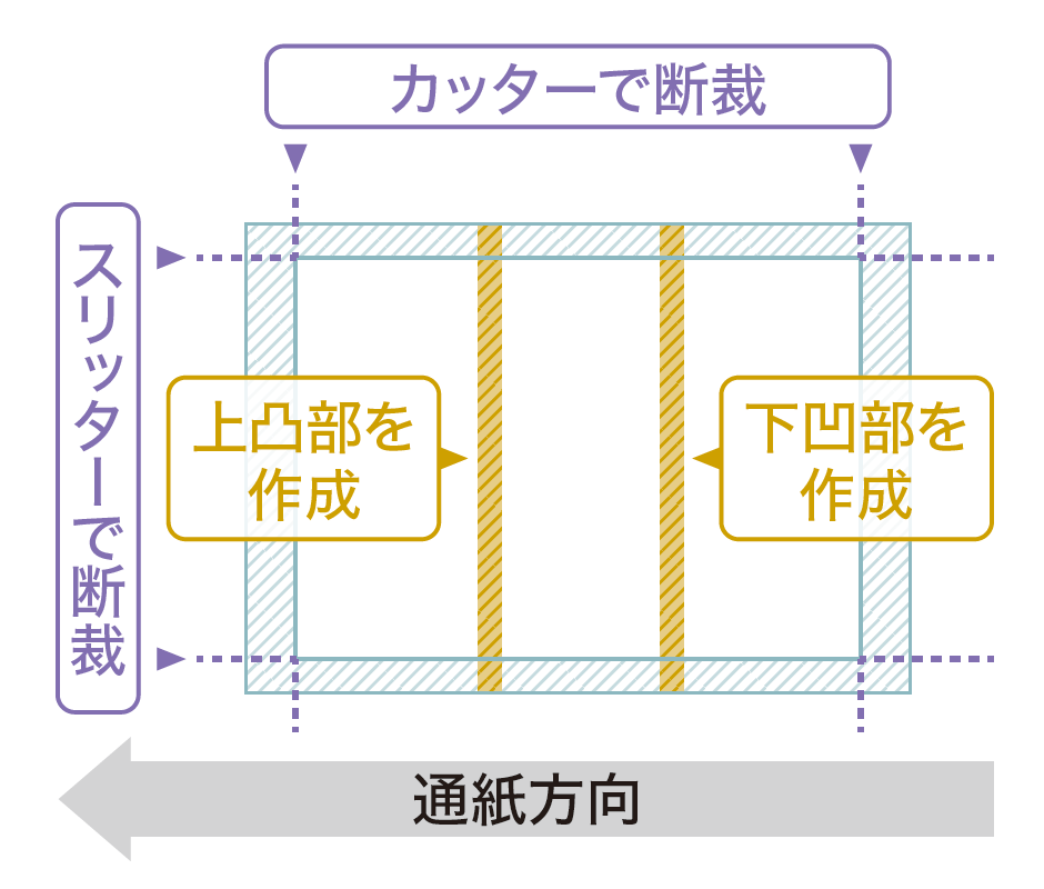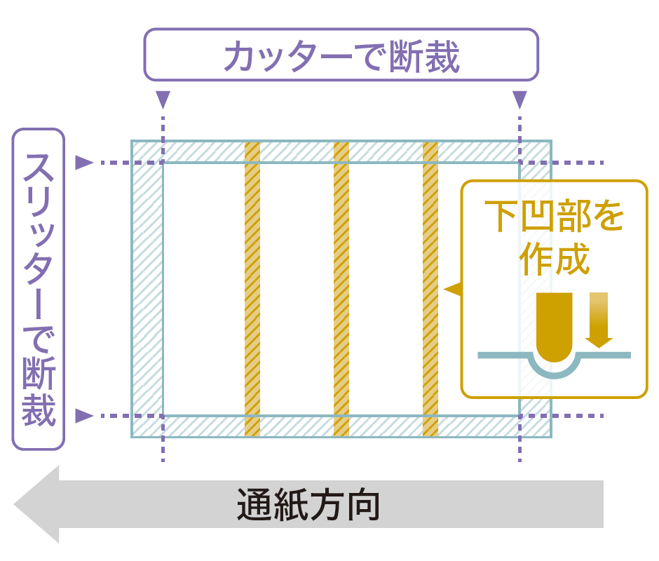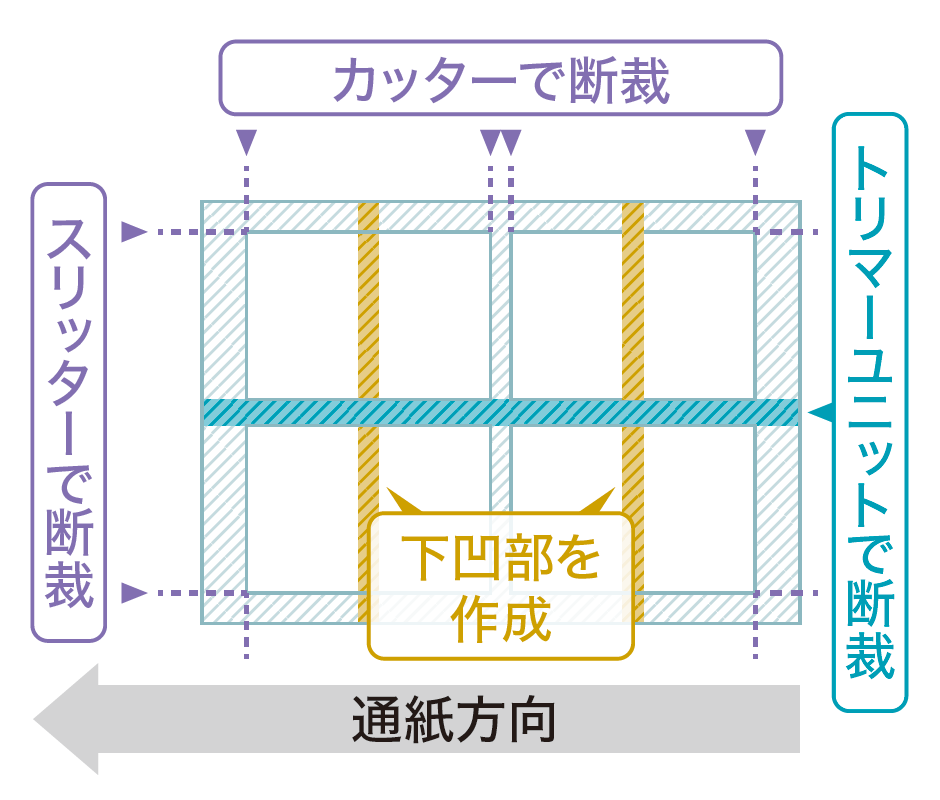 四方断裁のとき、通紙交差方向にスジ入れを表面と裏面に複数行い切り出します。