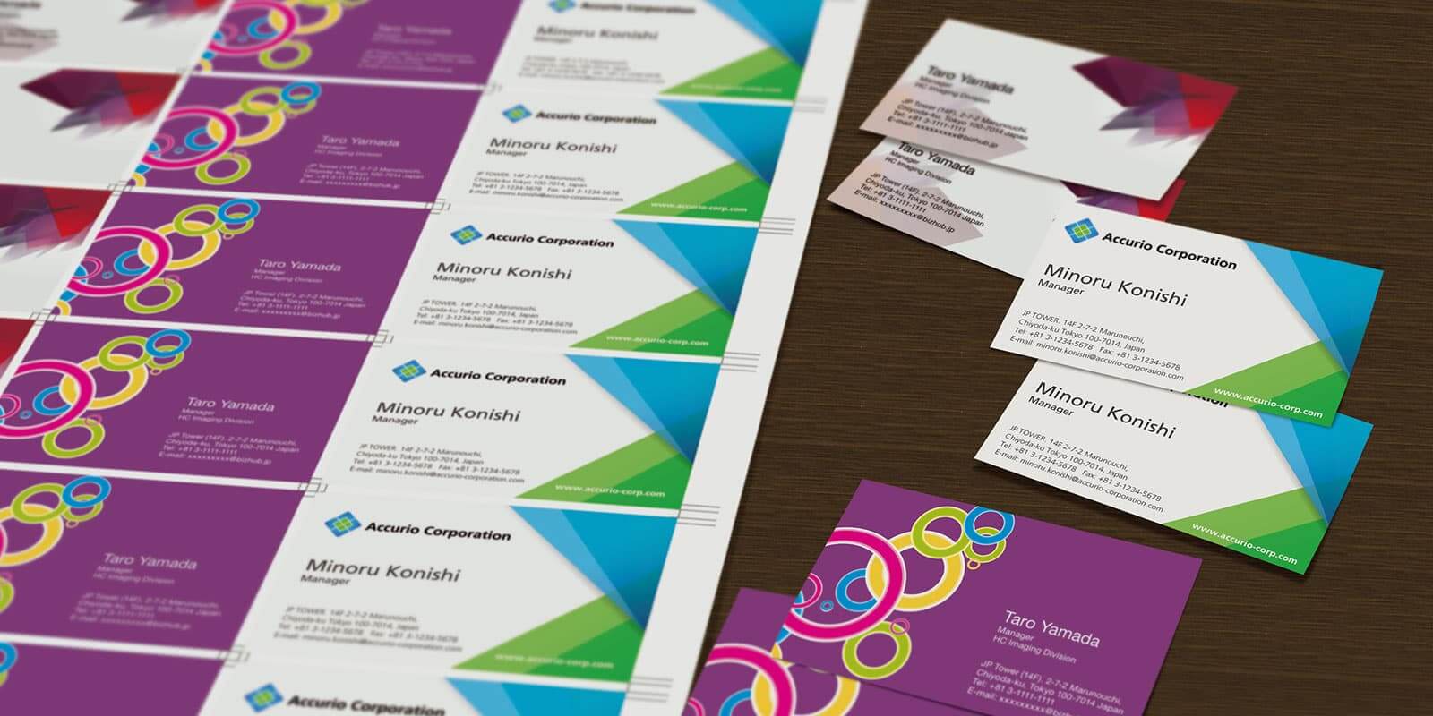 自動的に名刺サイズに用紙を断裁します。ドブ断ちスリッターと四方断裁を組み合わせ、多面付けして名刺を作成できます。