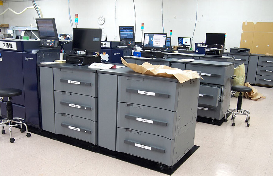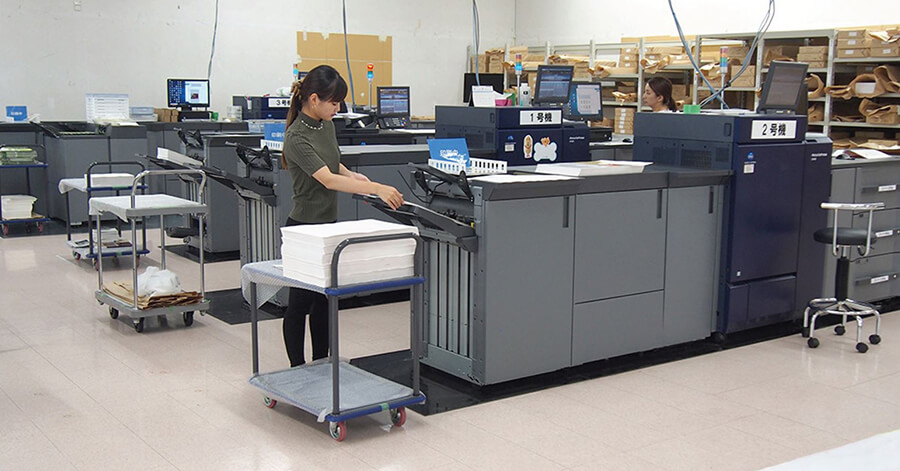 当初はAccurioPress C6100を2台導入し、半年後にもう1台追加。さらに半年後、ドキュメント中心の冊子等の需要に合わせてモノクロ専用機AccurioPress 6136を導入しました。冊子をメインに、名刺、チラシ、ショップカード、はがき、うちわなど幅広く対応されています。