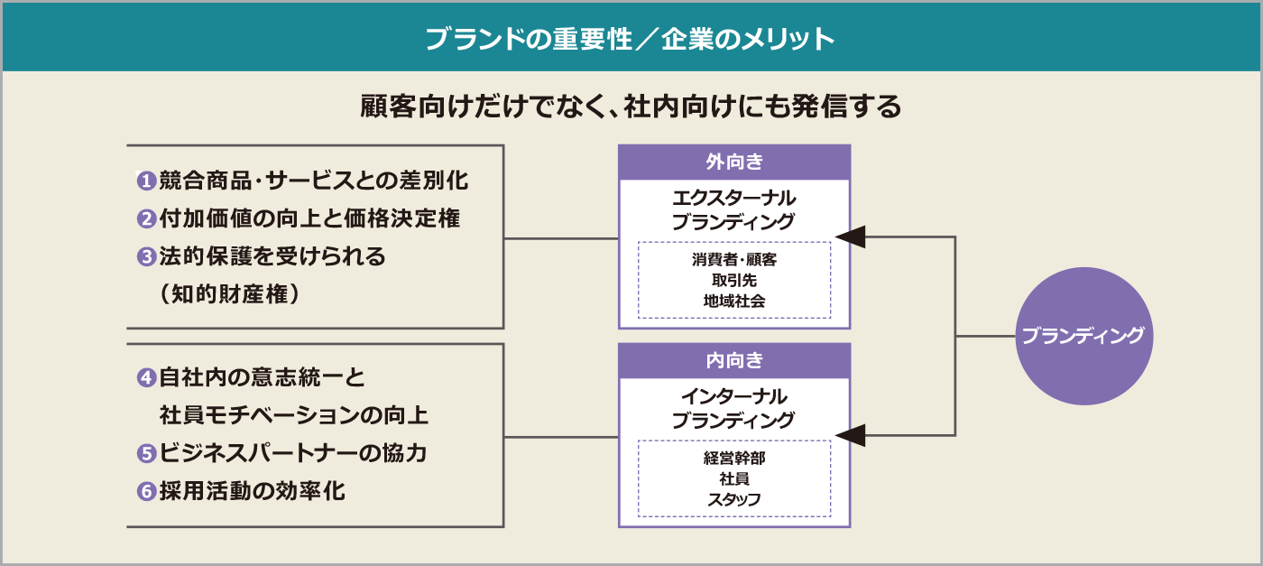 これらの社内向け(内向き)のブランディングは「インターナルブランディング(インナーブランディング)」と呼ばれ、消費者・顧客に対する外向きのブランディングである「エクスターナルブランディング」と一対となってブランディングを構成しています。