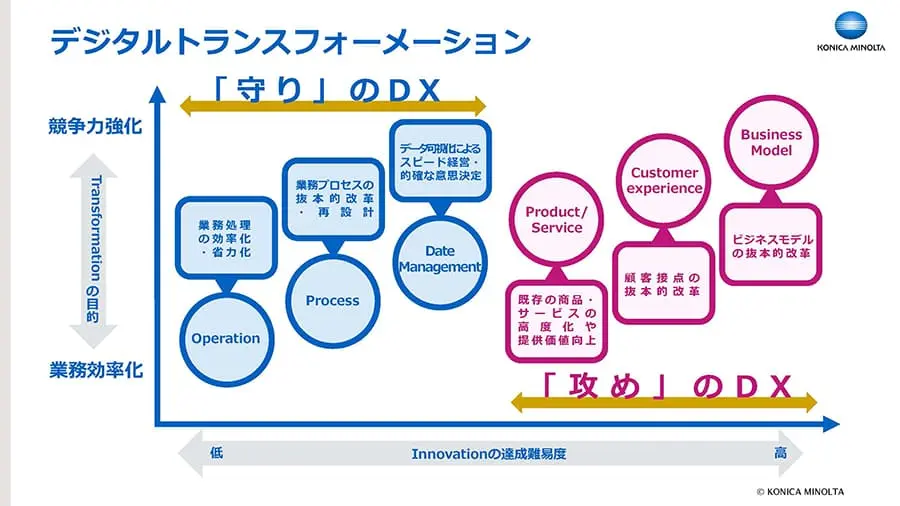 一方、守りのDXは社内で行うデジタルトランスフォーメーションを指し、業務プロセスの改善や蓄積データの見える化などが含まれます。これらの取り組みは企業の事業運営を最適化し、業務の効率を高めることを目的としています。例えば、印刷業界では印刷プロセスの自動化やデータ管理の効率化が守りのDXに該当します。