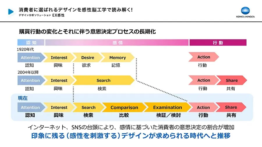 このような購買行動の変化により、購買に繋がる部分で「感情が占める割合」が非常に大きくなっています。消費者の購買意欲を引き出すためには、感情が重要な役割を果たすようになり、特に視覚から得た情報の感情価値(心を動かされる瞬間を作ること)が非常に大切になっているのです。