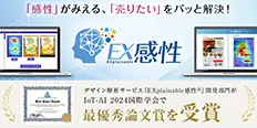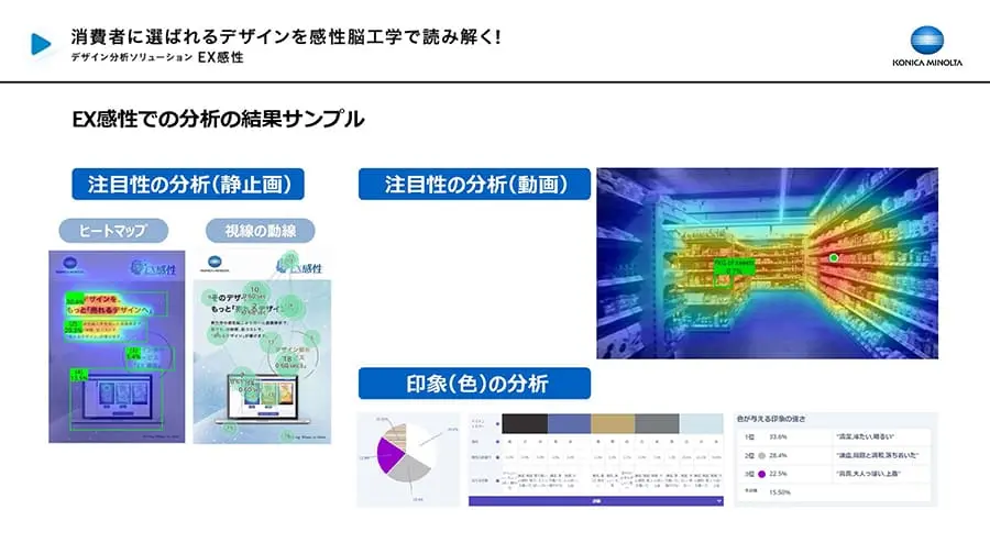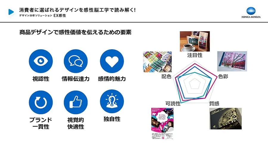 コニカミノルタが提供するEX感性は、独自の画像解析技術と感性脳工学を活用し、人が視覚から情報を得た際に脳内でどのような情報処理が行われるかを解明します。これにより「注目性」「配色」「色彩」「質感」「可読性」を定量的に可視化し、売れるデザインをクラウド上で評価・分析することが可能です。