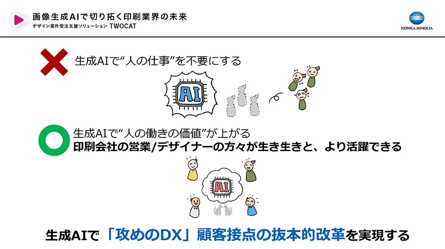 生成AIを活用することで現在働いている方々がより働きやすく、働き甲斐のある環境を作り出すことが重要だと考えています。このような考え方のもと、生成AIを活用して印刷業界の顧客接点の抜本的改革を支援していきたいと考えています。