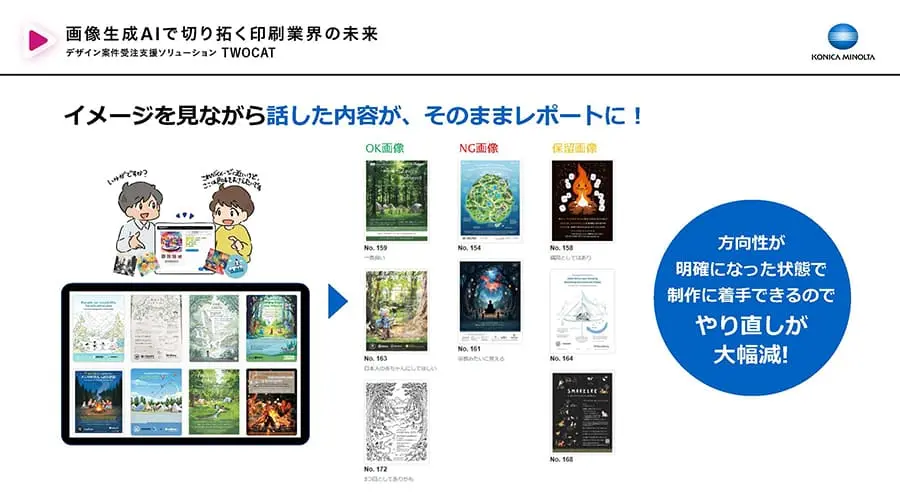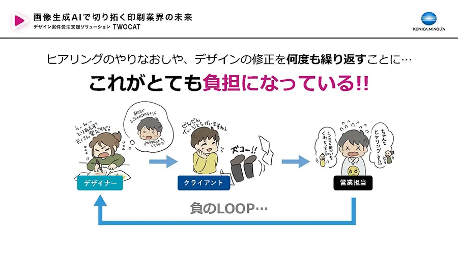 そこでコニカミノルタは、研究開発中のデザイン案件受注支援ソリューション「TWOCAT」を通じて、デザイン商談におけるこうした課題を解決し、顧客接点の強化を実現したいと考えています。