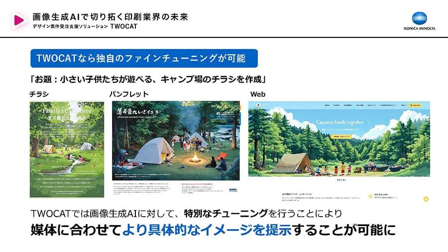 世の中では様々な画像生成AIが活用されていますが、現時点ではチラシやパンフレットなどのデザインを作ることは難しく、イメージのすり合わせに使えませんでした。しかしTWOCATは、機械学習において学習済みのモデルを特定のタスクやデータセットに適応させるために調整する手法(ファインチューニング)を行うことで、実際のデザイン商談時にも使えるリアルなデザインをその場でお見せすることができます。