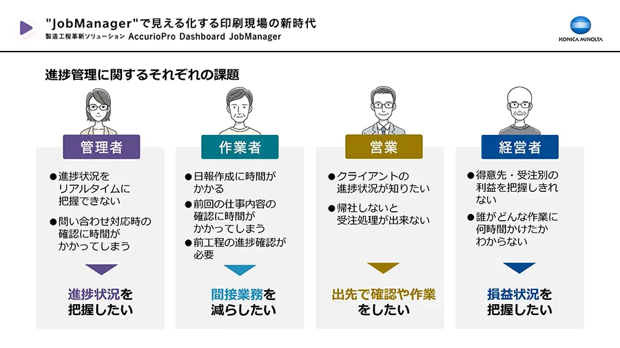 コニカミノルタが提供するAccurioPro Dashboard JobManagerを活用することで、先ほどの3つのポイントをすべて実施することができます。JobManager以外でも実施可能ですが、一からシステムを構築する必要がなく、非常に安価で簡単に始めることができます。
