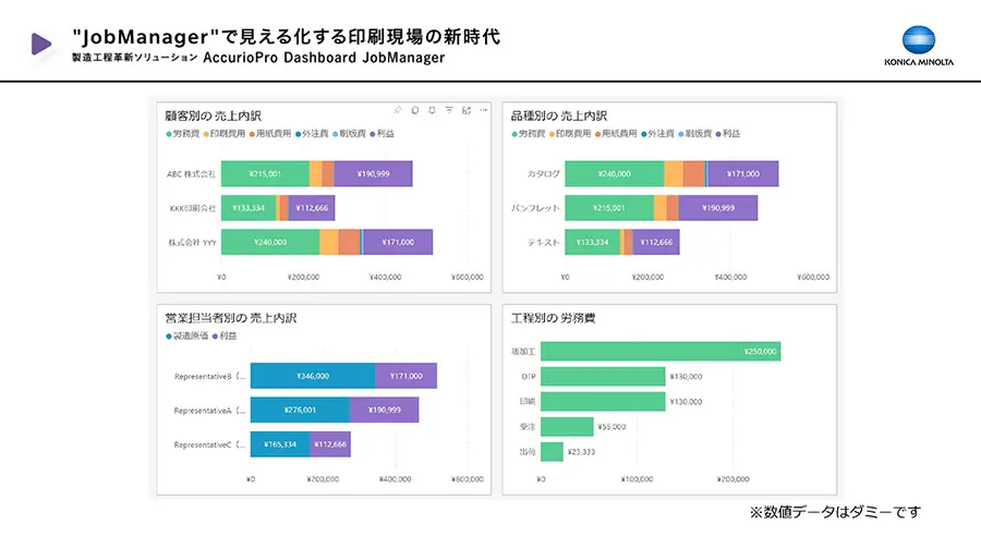 こちらはダミーの数値データですが、どのクライアントの売上比率が高いか、カタログやパンフレットなど品目ごとに最も労務費がかかっているのは何か、営業担当者ごとの売上などをきちんと把握することができます。