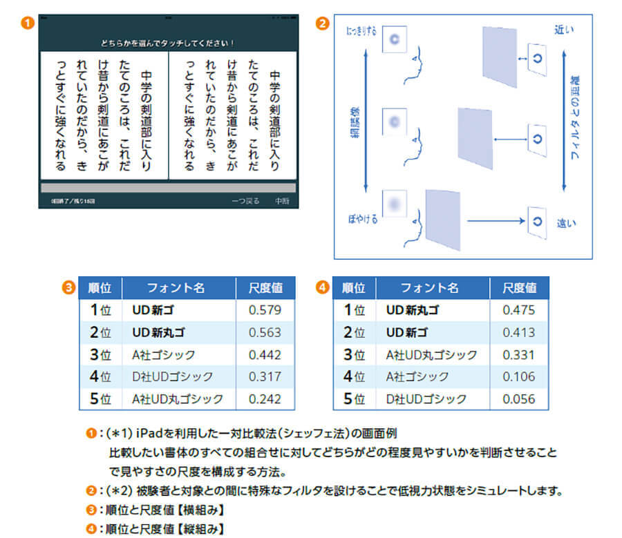 UDフォントについては当事者にとって実際に読みやすいかどうか、という点がもっとも大事な要素にはなり、モリサワのUDフォントもさまざまな観点からその検証や実証を行っています。UD新ゴ、UD新丸ゴ、UD黎ミンについては、慶應義塾大学の中野泰志教授による比較研究実験により、低視力シミュレーションやロービジョンの方を対象とした検証などが実施されており、読みやすさとしての実証や評定として公表しています。