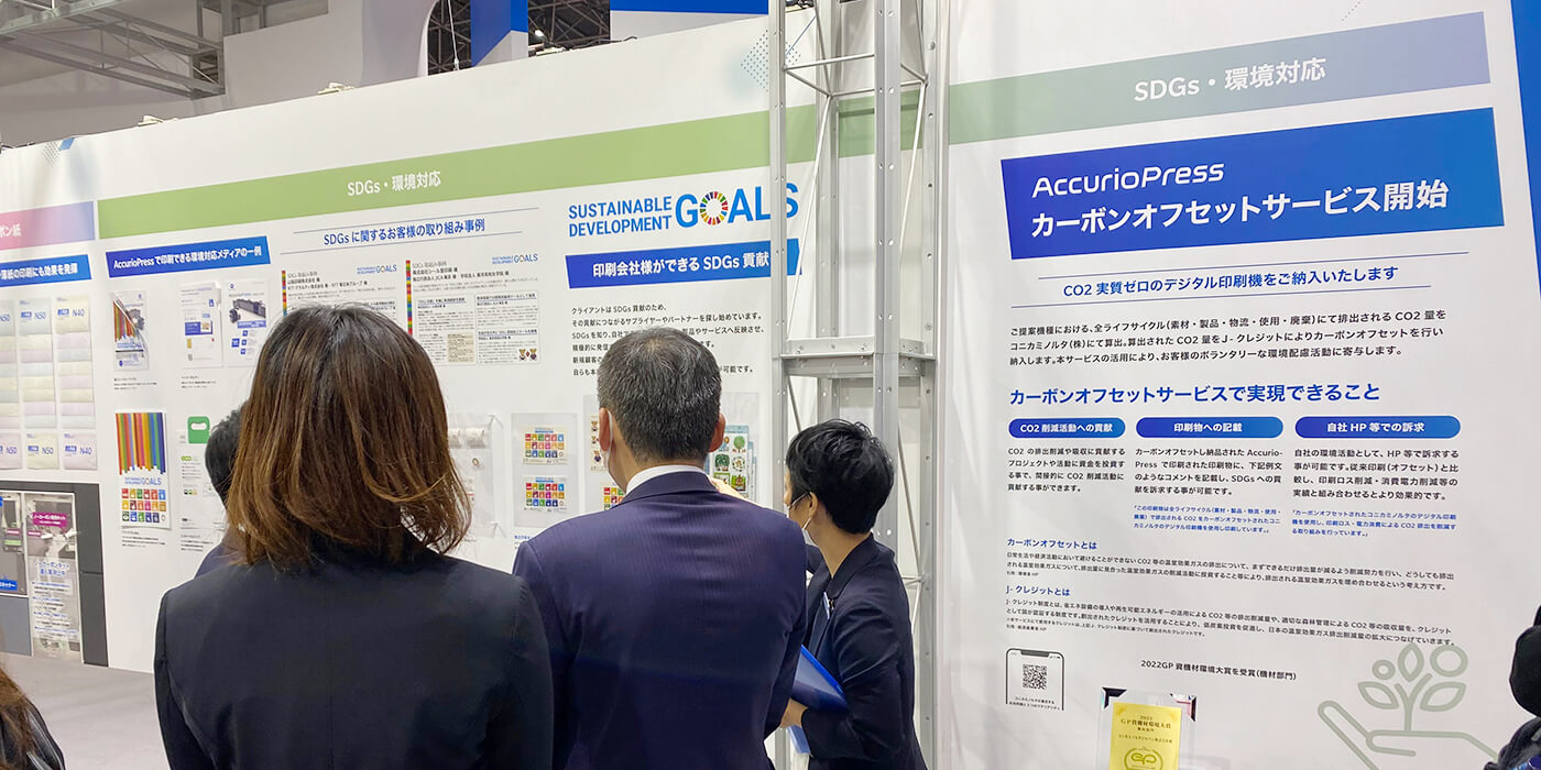 印刷産業での環境保全を含めたSDGs活動の必要性や重要度もますます高まっており、IGAS2022でも環境に配慮した無駄のないものづくりが各ブースで提案されました。コニカミノルタは、印刷会社のSDGs活動を支援する新サービスをIGAS2022で発表。“CO2実質ゼロのデジタル印刷機を納入する”という新サービスは、印刷会社のSDGs活動を”いますぐ具体的に支援できる”サービスとして、多くの反響やご相談をいただきました。