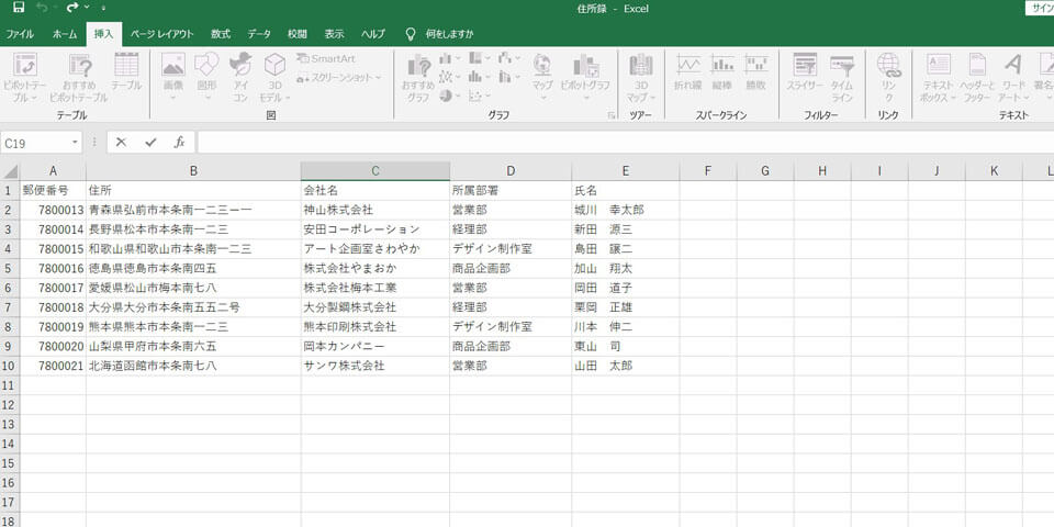 はじめにExcelで住所録を作成し、CSV形式で保存します。住所録の作成は、以下の手順を参考にしてください。