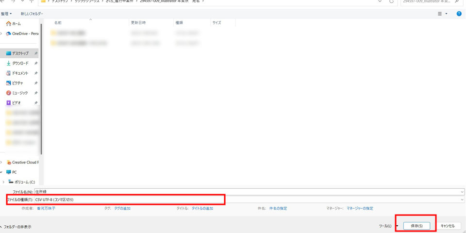 | 手順3 | 住所録が完成したら「ファイル」タブから「名前を付けて保存」をクリックし、「ファイルの種類」の「CSV UTF-8(コンマ区切り)」を選択する。 |
