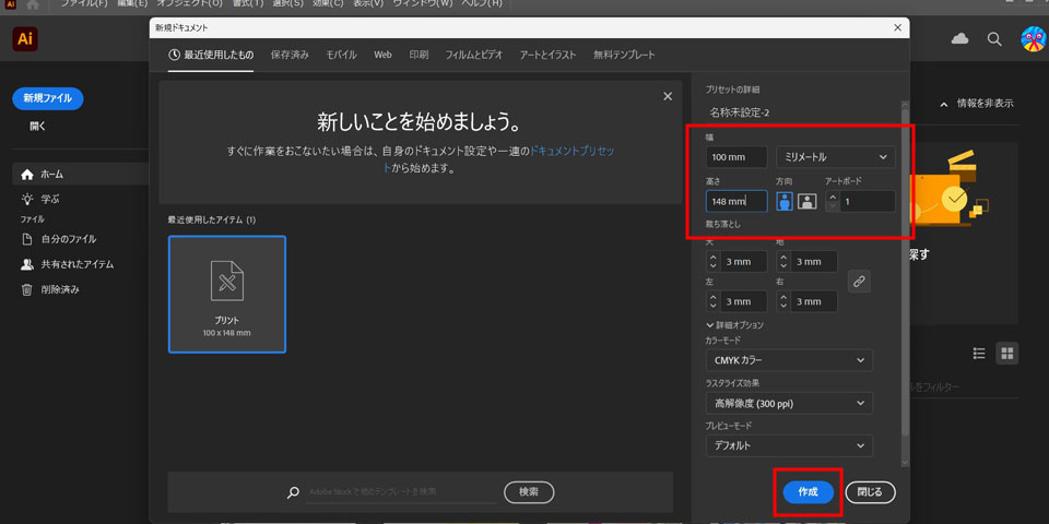 「ファイル」メニューから「新規」を選択してドキュメントサイズをハガキサイズ(100㎜×148㎜)に設定し「作成」をクリックしましょう。