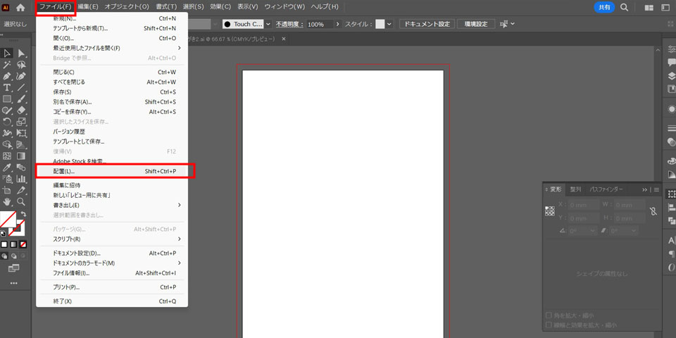| 手順1 | Illustratorの「ファイル」メニューから「配置」を選択する。 |