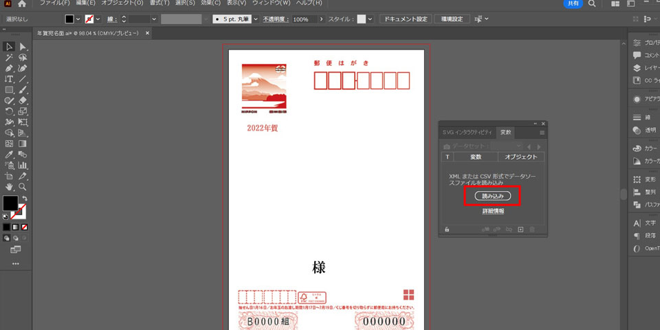 Illustratorのウィンドウメニューから「変数」を選択して「変数」パレットを表示します。変数パネルの中央にある「読み込み」ボタンをクリックし、住所録のCSVファイルを読み込みましょう。これにより、CSVファイルの宛名情報がIllustrator内で変数として認識されます。