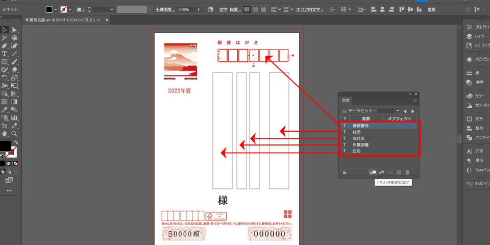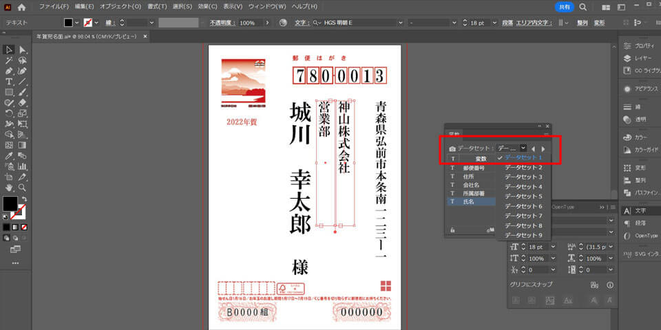 次に変数パレット中央下にある「テキストを動的に設定」ボタンをクリックすることで、テキストボックスとCSVファイル(住所録)の情報が紐付けられます。ほかの宛名項目(住所・会社名・所属部署・氏名など)も同様に紐付けができたら、変数パネルの「データセット」から「データ1」を選択して仕上がりを確認します。書体の種類・サイズ・間隔などを調整してキレイなレイアウトになるよう仕上げましょう。