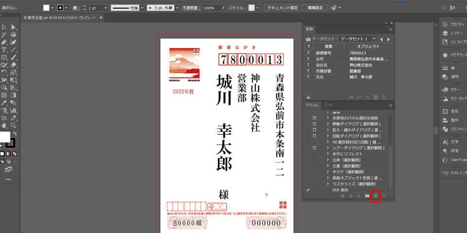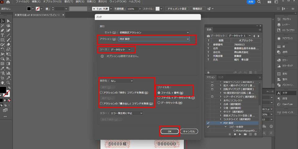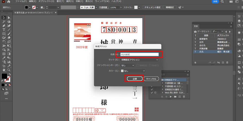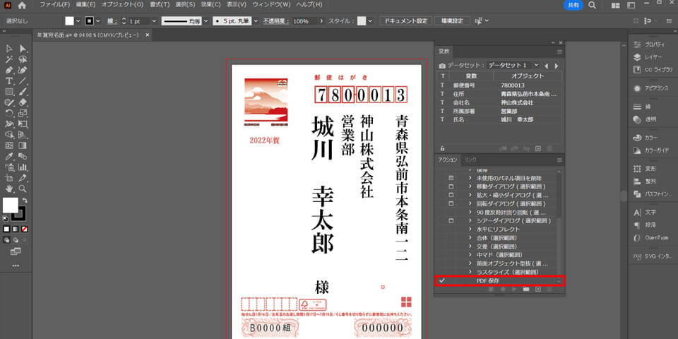 すべての宛名情報を紐付けしたら、各データセットをPDF保存するために「アクション」を作成します。変数パネルから「データセット1」「データセット2」と順に切り替えた個別保存も可能ですが、データ量が多いと手間がかかり非効率です。PDF保存用のアクションを作成し、次項のバッチ処理を行なうことで大量のハガキデータも一括でPDF保存できます。
