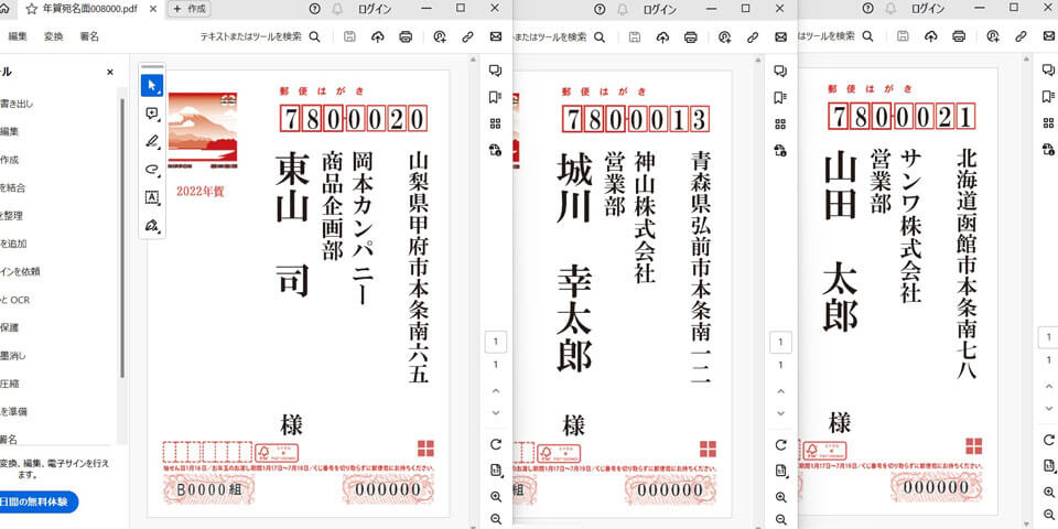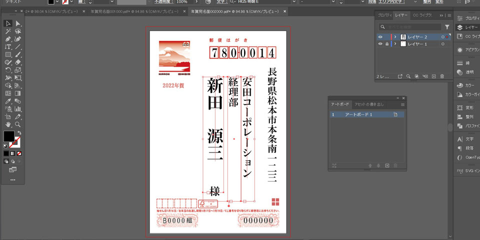 ファイルメニューの「開く」を選択し、前項でPDF保存した宛名面の年賀ハガキを1つずつ選んでIllustrator上で開きましょう。PDFファイルをIllustrator上で開くことにより、各宛名情報の編集・修正が可能になります。