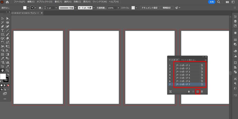 次に「ウィンドウ」メニューの「アートボード」を選択し「アートボード」パレットを表示しましょう。アートボードパレットを表示させたら右下にある「+」(新規アートボード)ボタンをクリックし、送り先の数だけアートボードを作成します。