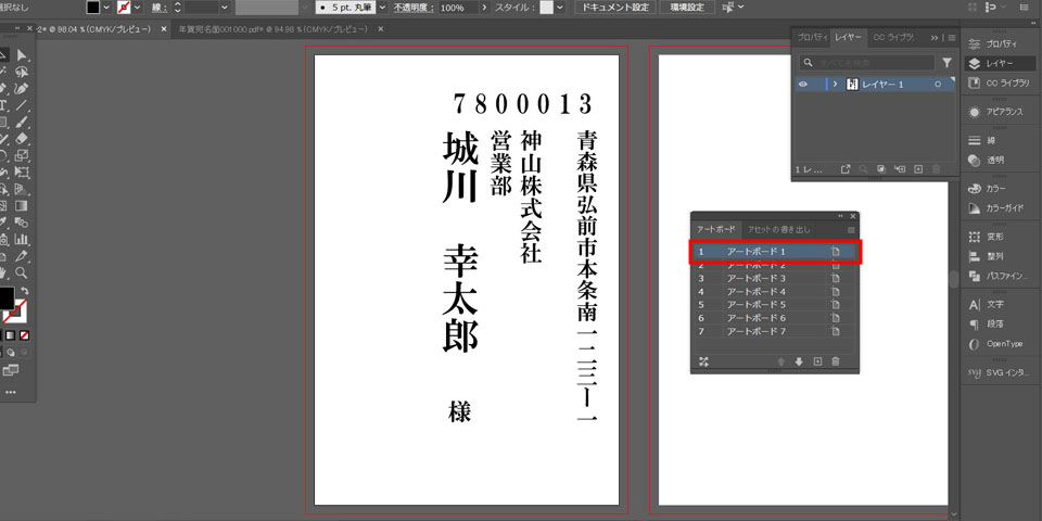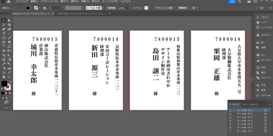 ハガキデータ(PDFファイル)の微調整からアートボードへの転記まで一連の作業を繰り返し、すべて宛名データを各アートボードに配置しましょう。