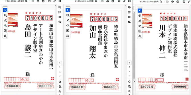 Illustratorに戻り、すべての宛名情報を配置した年賀ハガキの印刷準備を進めていきましょう。同一ファイルに年賀ハガキの数だけアートボードを作成し、印刷準備を整えます。これにより、複数の宛名を一括で管理できるようになります。