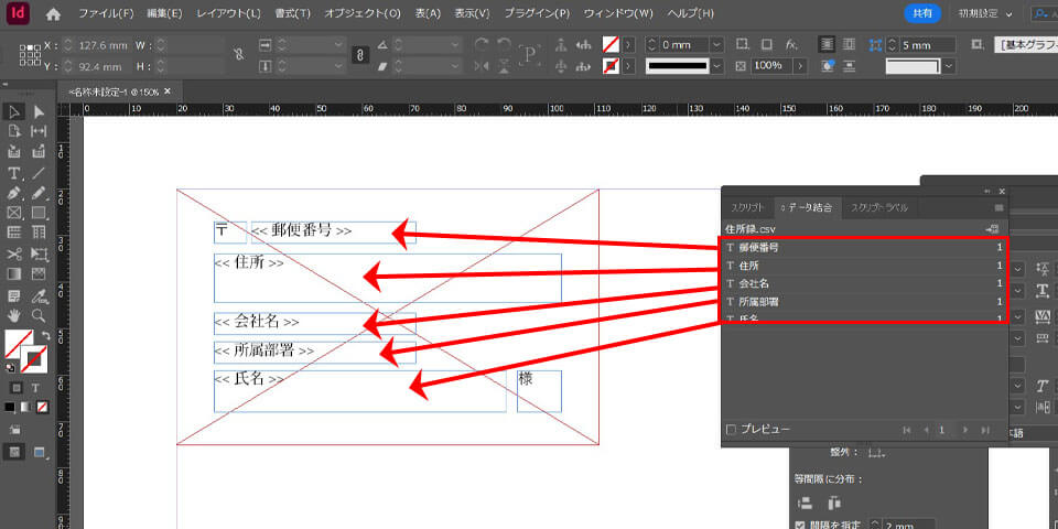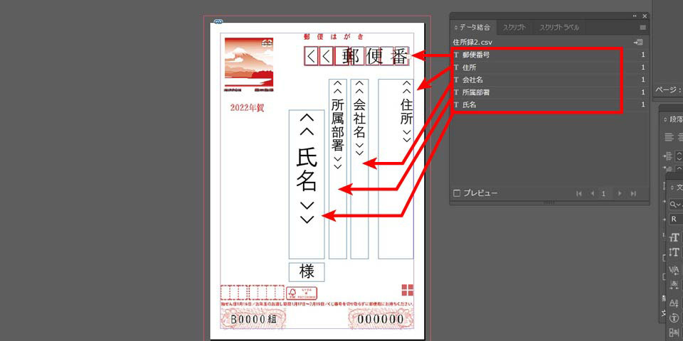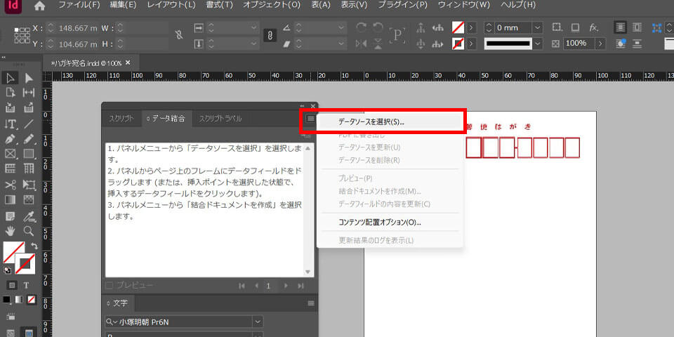 ここでは、InDesignのデータ結合機能を用いてハガキの宛名面を作成する手順をご紹介します。