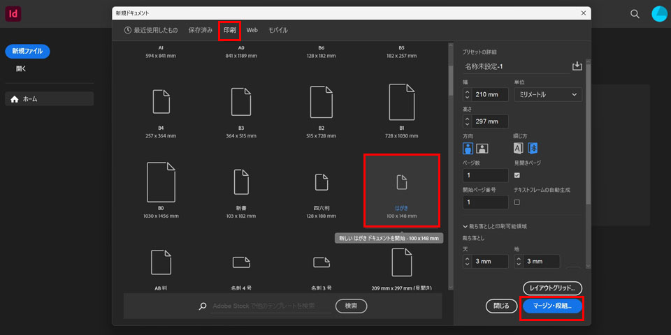 「ファイル」メニューから「新規」を選び、「ドキュメント」をクリックして官製ハガキサイズ(幅100mm×高さ148mm)に設定します。もしくは、新規→ドキュメント→印刷→すべてのプリセットを表示の順にクリックし「はがき」を選択してください。