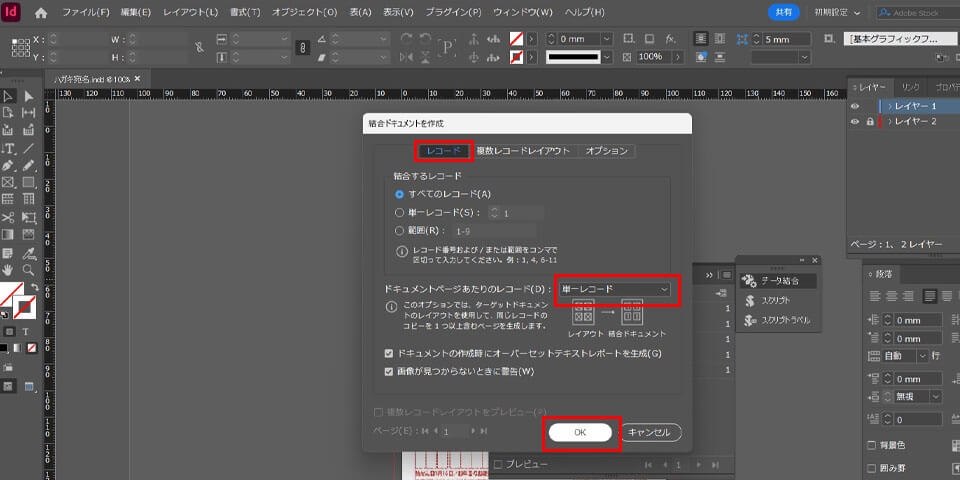 「レコード」タブの「ドキュメントページあたりのレコード」を「単一レコード」に切り替え、OKボタンを押して完成です。