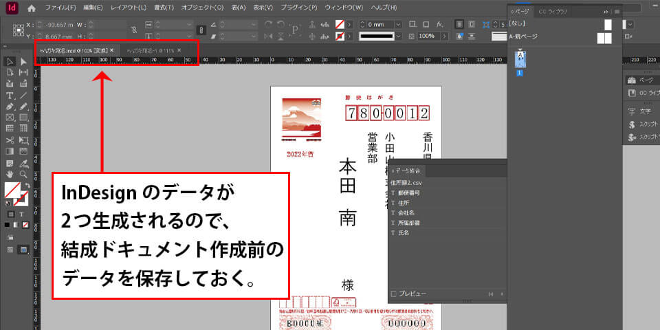 結成ドキュメントを作成すると、作成前と作成後のデータが2つ生成されます。次年も同様に年賀状の宛名を作成する際は、作成前のInDesignデータを保存しておくとよいでしょう。