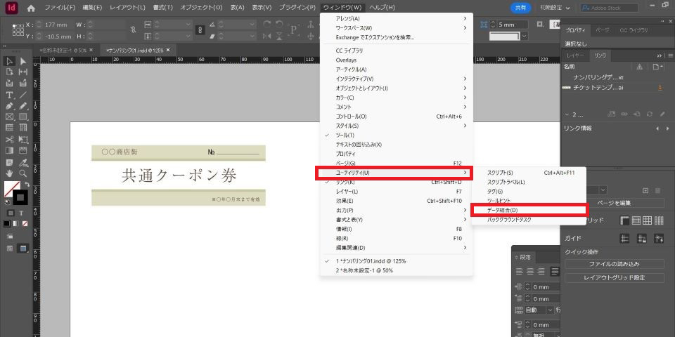 InDesignのウィンドウメニューから「ユーティリティ」を選択し「データ結合」をクリックします。