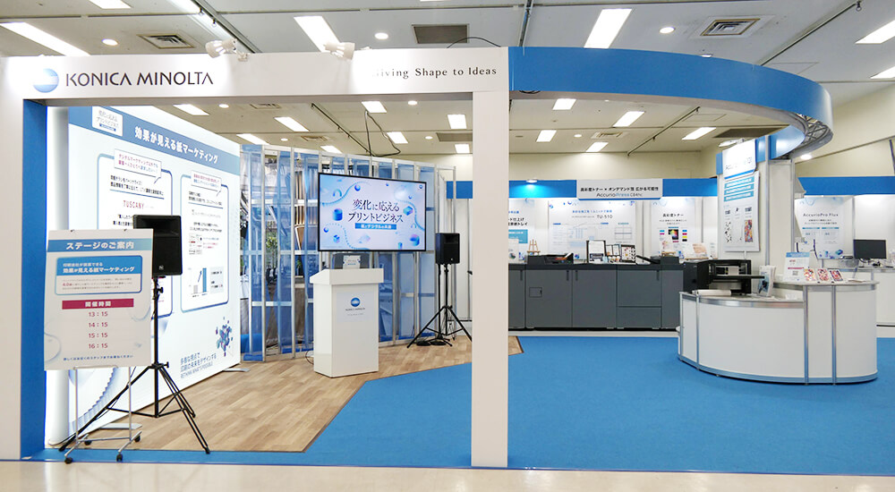 コニカミノルタブースでは「変化に応えるプリントビジネス ~紙とデジタルの共創~」をテーマに、つねに変化するニーズや環境に対応し、印刷業界がサステナブルであるための取り組みに貢献できる製品やソリューションを中心に展示を行いました。