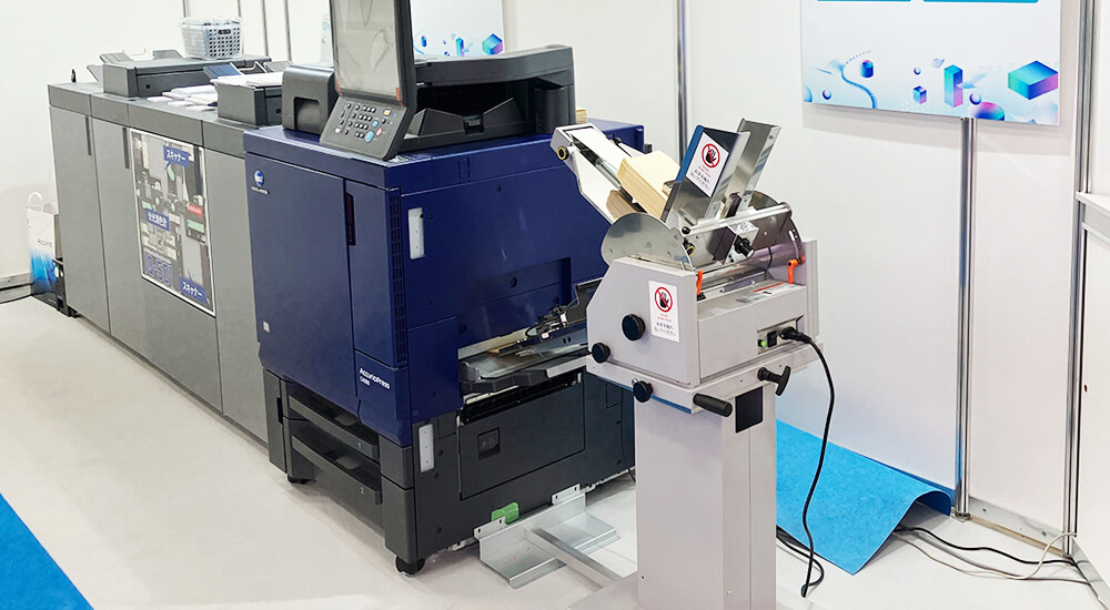さらにAccurioPress C84hcでは、デジタル印刷機で自動断裁ができる加工ユニットTU-510を活用したポストカードサンプルを展示。PDFの自動面付け機能やTU-510の断裁設定が自動で行えるAccurioPro Fluxと連携し、面付け~出力~断裁までの印刷工程における自動化や省力化をご提案しました。