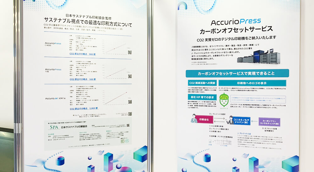 コニカミノルタでは以前から印刷会社の環境配慮を支援する「CO2実質ゼロのデジタル印刷機を納入するAccurioPress カーボンオフセットサービス」を展開していますが、page2024では日本サステナブル印刷協会監修のもと、サステナブル視点での最適な印刷方式についてのパネル展示を行いました。