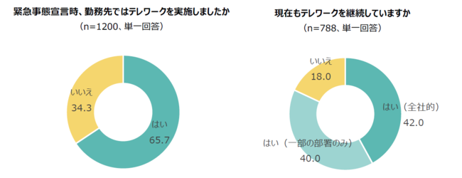 例えば、緊急事態宣言から半年後の2020年9月に行われたアデコのアンケート調査によれば、緊急事態宣言下でテレワークを実施した企業が65.7%、現在もテレワークを継続している企業が82%に達しています。