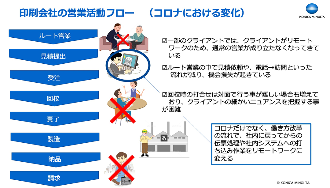 新型コロナウイルスの影響が収束しないなか、多くの企業でテレワークや在宅勤務が導入されています。その結果、印刷業の営業活動においても非対面営業が求められるなど、企業にとってはコロナ環境下でも事業を継続していくBCP対策という側面もあります。